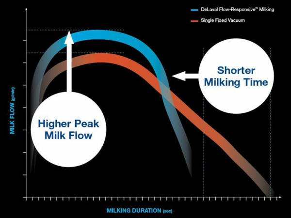 - >10% rychlejší/ úspora 50 sekund na poslední krávu stimulovanou nastaveným průtokem[1]
