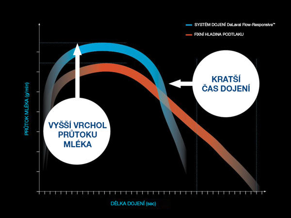 Další funkcí technologie Flow-Responsive Milking je Flow-Responsive Vacuum, což představuje revoluční změnu v aplikaci hladiny dojícího podtlaku. Na rozdíl od pevných hladin podtlaku se Flow-Responsive Vacuum přizpůsobuje aktuálnímu průtoku mléka. To nejen optimalizuje dojení, ale také chrání zdraví struků. S 9% nárůstem maximálního průtoku mléka a pozitivními účinky na zdraví konečků struků Flow-Responsive Vacuum stanovuje nový standard v efektivitě dojení. Zrychluje proces dojení, umožňuje platformě otáčet se rychleji, což zajišťuje větší průtok a kratší směny."