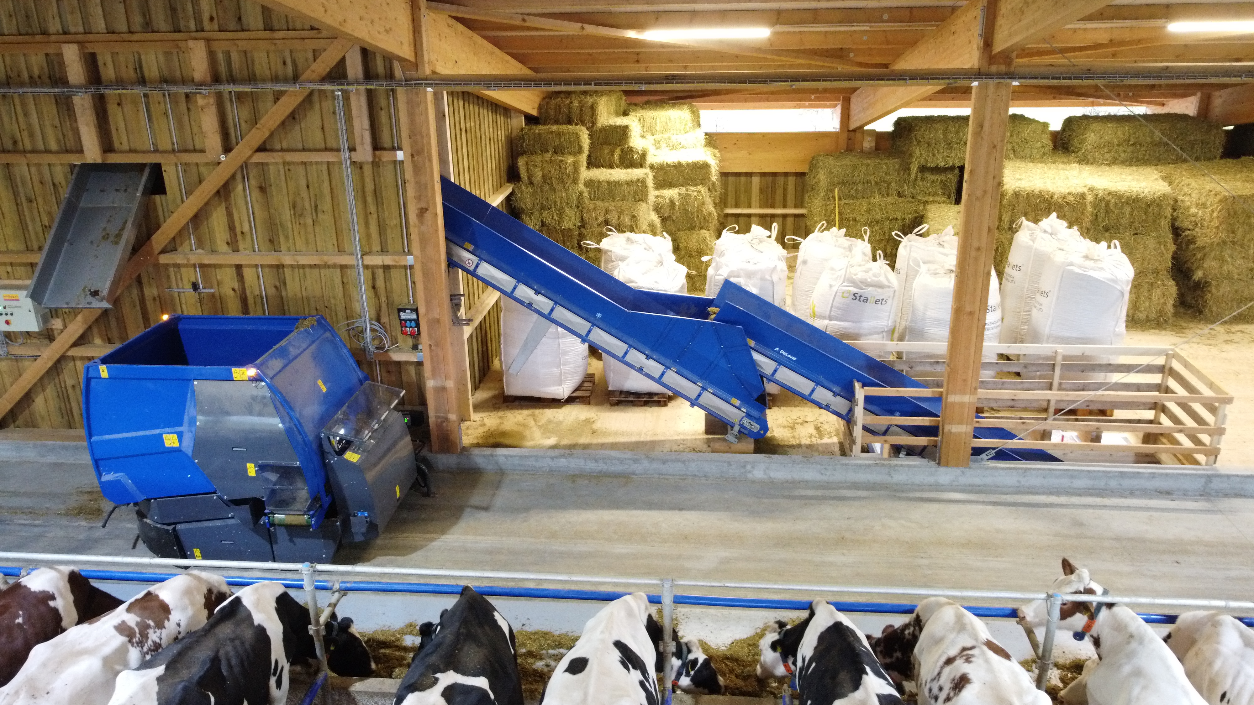 Die automatische Fütterung erfolgt über drei Befülltische und eine Siloanlage, die das Futter in den Futtermischer leitet. Über den Verteilwagen ORB wird das Futter gleichmässig und effizient am Futtertisch verteilt, was den Arbeitsaufwand für Familie Stadler weiter minimiert und gleichzeitig eine gleichbleibend hohe Futterqualität gewährleistet.
