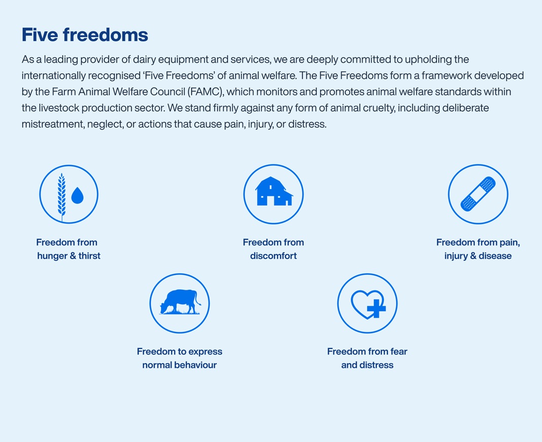 As a world leader in dairy equipment and services, we are against any act of animal cruelty. This relates to neglect caused by ignorance or incompetence, as well as wilful mistreatment and neglect of animals, and acts that maliciously cause pain, injury, or suffering. Our ambition is to be a driver of positive change worldwide in our field, actively developing farming solutions, services, and practices that reduce stress and discomfort for animals, thereby enhancing their overall quality of life.