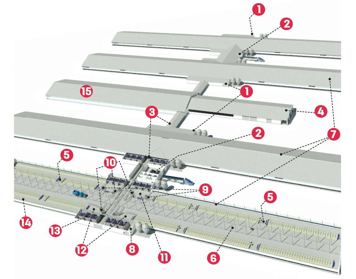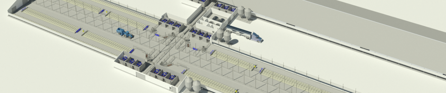 - Nouvelle structure entre les étables existantes avec des salles dédiées aux robots, une chambre à lait, des équipements, un bureau, etc.