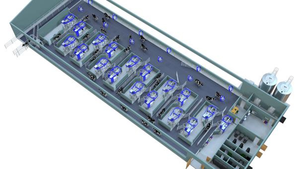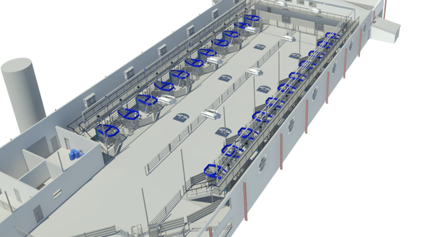 - Ces groupes sont ensuite amenés à un centre de traite avec plusieurs robots VMS disposés dans une configuration qui ressemble à une stabulation parallèle, incluant une aire de rassemblement centrale.