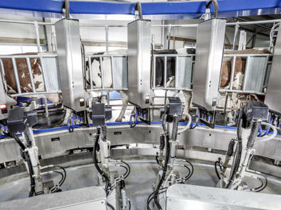 Au premier coup d'œil, on dirait une salle de traite rotative normale. Toutefois, personne ne trait ! Jusqu'à cinq bras robotisés assurent la traite : préparation des trayons, pose des gobelets trayeurs, pulvérisation hygiénique après la traite. L'AMR™ DeLaval peut traire jusqu'à 90 vaches/heure. En d'autres termes, il a la capacité de traire en troupeau de 540 têtes trois fois par jour ou de 800 têtes deux fois par jour ou n'importe quelle combinaison entre les deux. L'AMR™ DeLaval réduit la main d'œuvre nécessaire pour la traite et permet aux éleveurs ou à leurs employés de se concentrer sur des tâches plus stimulantes. Il répond aux souhaits de ceux qui travaillent dans l'industrie laitière de nombreuses façons. Voyez grand ou commencez petit. L'AMR™ DeLaval est un système adaptable convenant à tous les types d'exploitation, en logettes, en stabulation libre ou en élevage sur prairie. Offrez-vous les cinq bras ou commencez avec seulement deux bras robotisés et ajoutez-en d'autres à mesure que votre activité croît.