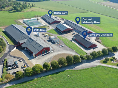 Il s’agit du plus grand développement jamais réalisé dans l’histoire de la ferme, couvrant 12 000 m², soit environ la taille de deux terrains de football, et comprenant trois nouvelles étables : une maternité et étable pour veaux, une étable pour génisses, et une étable VMS faisant également office de centre de visite. L’étable VMS est équipée de quatre DeLaval VMS™ V310 et d’un DeLaval VMS™ V300.