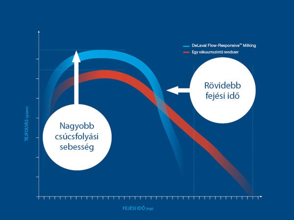 A tejfolyás-vezérelt fejéstechnológia egy másik funkciója a tejfolyás-vezérelt vákuum, amely forradalmi változást jelent a fejési vákuumszintek alkalmazásában. A rögzített vákuumszintekkel ellentétben a tejfolyás-vezérelt vákuum alkalmazkodik a tejleadáshoz, oly módon, hogy a legnagyobb tejfolyás idején a fejési vákuum szintjét akár 48-50 kPa-ra is megnöveli, a tőgyegészség veszélyeztetése nélkül. A csúcs tejáramlás akár 9%-kal több is lehet, amivel elérhető a fejés idejének akár 10%-os csökkentése is. A tejfolyás-vezérelt vákuum technológia így új mércét állít fel a fejés hatékonyságának növelésében. A gyorsabb fejési folyamat lehetővé teszi a platform gyorsabb forgatását, így nagyobb áteresztőképességet és rövidebb műszakot biztosít.
