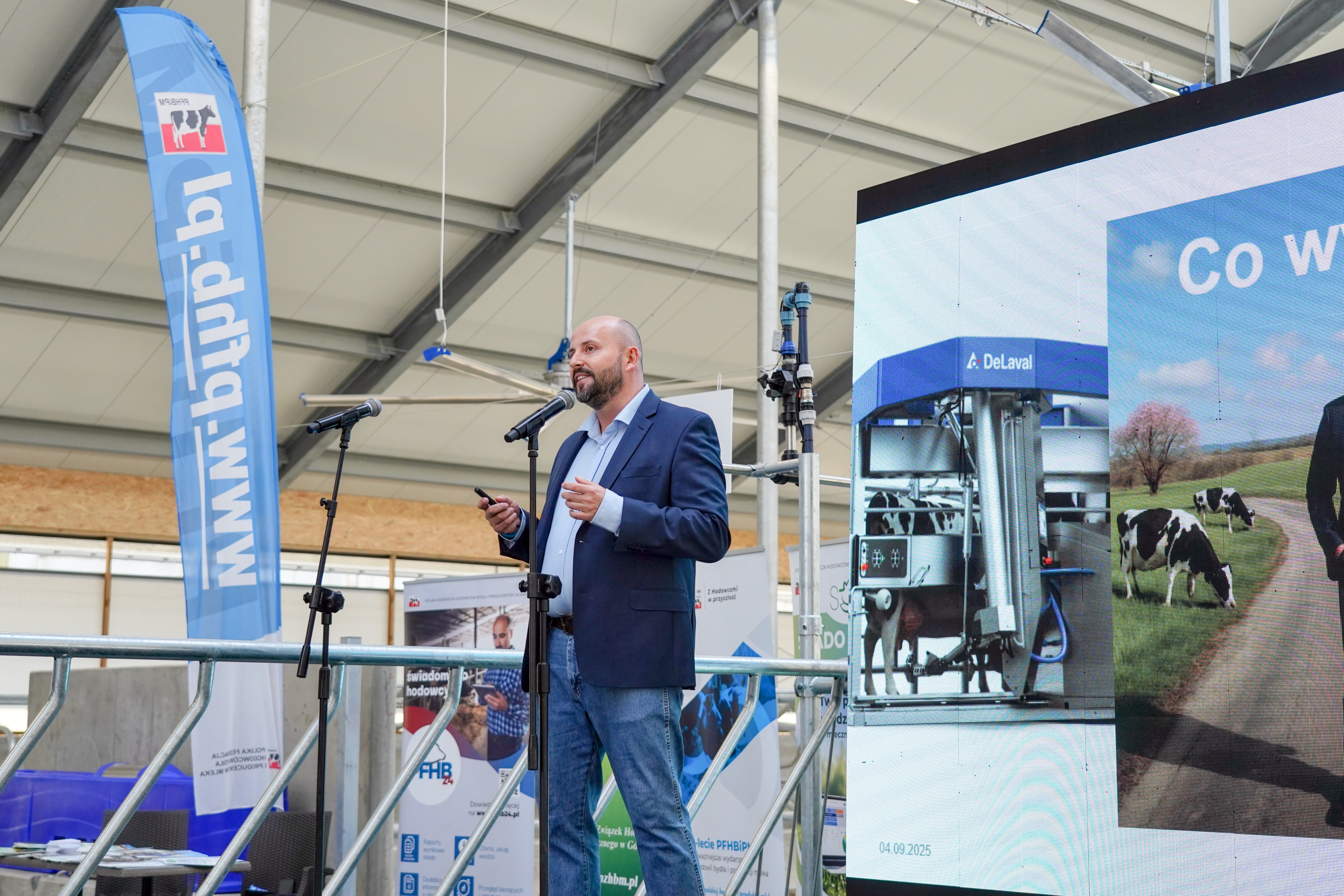 Pierwsza część uroczystości rozpoczęła się prezentacją Marcina Wasilewskiego, Menadżera Rozwiązań Systemowych ds. automatycznych systemów doju, który przybliżył gościom zasady działania systemu doju grupowego. Następnie odbyło się oficjalne przecięcie wstęgi przed budynkiem udojni, po którym goście mieli okazję zwiedzić przestronny obiekt z 24 robotami udojowymi DeLaval VMS™ V300 oraz 25-tym robotem na porodówce. Po części oficjalnej uczestnicy wrócili do obory, gdzie przy akompaniamencie saksofonu na żywo i poczęstunku mogli delektować się wyjątkową atmosferą tego innowacyjnego gospodarstwa.