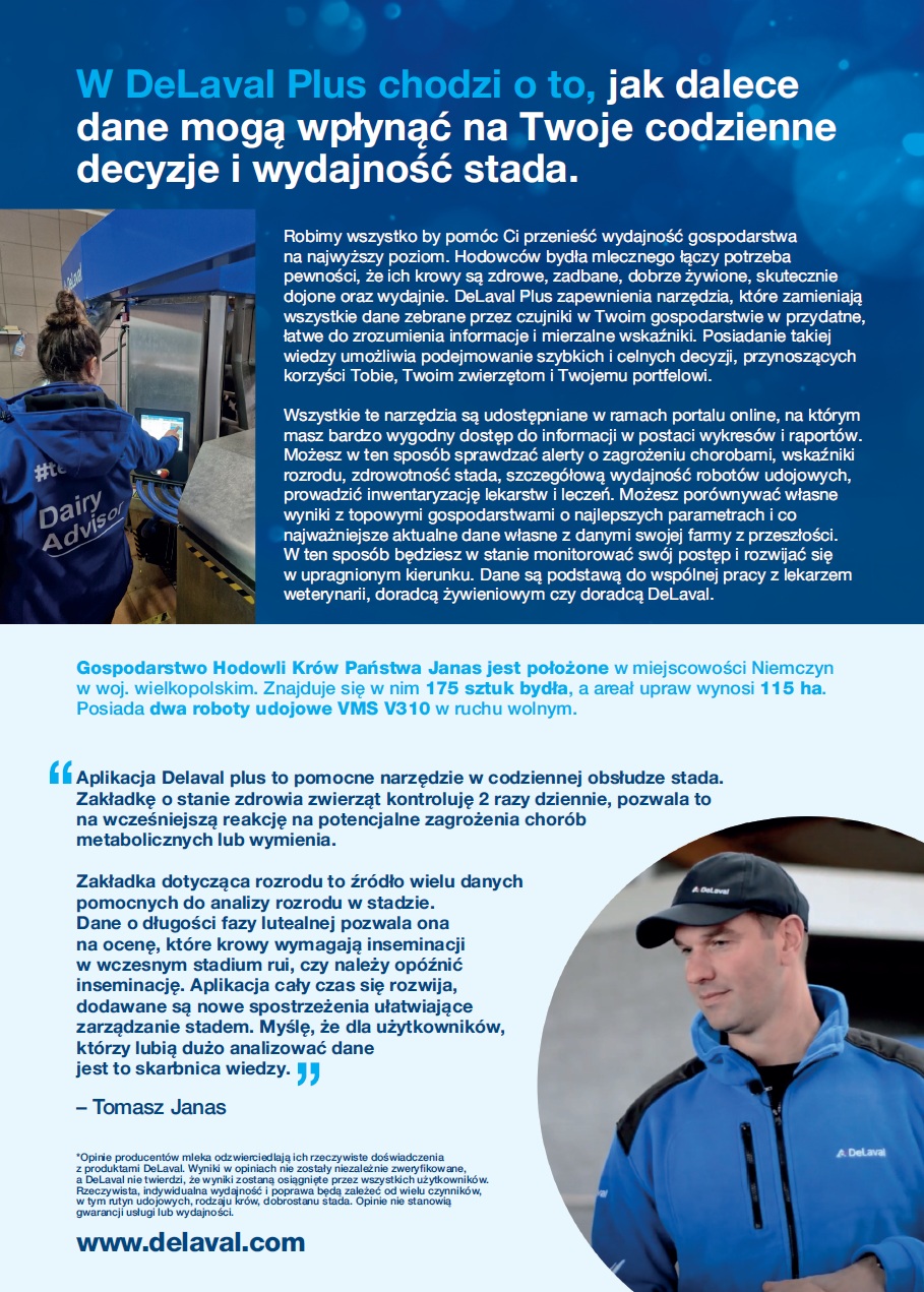 "Aplikacja Delaval plus to pomocne narzędzie w codziennej obsłudze stada. Zakładkę o stanie zdrowia zwierząt kontroluję 2 razy dziennie, pozwala to na wcześniejszą reakcję na potencjalne zagrożenia chorób metabolicznych lub wymienia. Zakładka dotycząca rozrodu to źródło wielu danych pomocnych do analizy rozrodu w stadzie. Dane o długości fazy lutealnej pozwala ona na ocenę, które krowy wymagają inseminacji w wczesnym stadium rui, czy należy opóźnić inseminację. Aplikacja cały czas się rozwija, dodawane są nowe spostrzeżenia ułatwiające zarządzanie stadem. Myślę, że dla użytkowników, którzy lubią dużo analizować dane jest to skarbnica wiedzy."