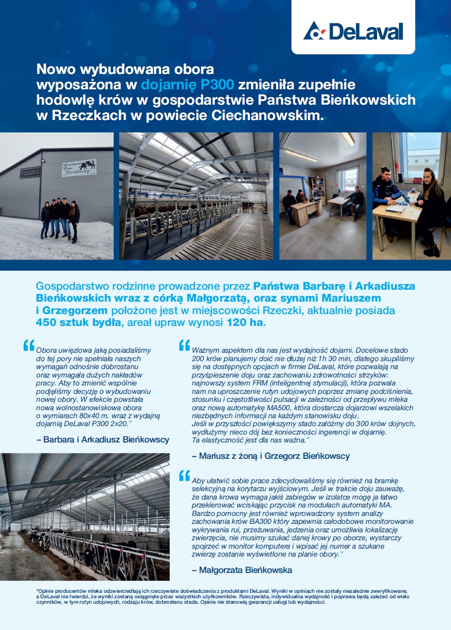 "Obora uwięziowa jaką posiadaliśmy do tej pory nie spełniała naszych wymagań odnośnie dobrostanu oraz wymagała dużych nakładów pracy. Aby to zmienić wspólnie podjęliśmy decyzję o wybudowaniu nowej obory. W efekcie powstała nowa wolnostanowiskowa obora o wymiarach 80x40 m. wraz z wydajną dojarnią DeLaval P300 2x20. – Barbara i Arkadiusz Bieńkowscy"