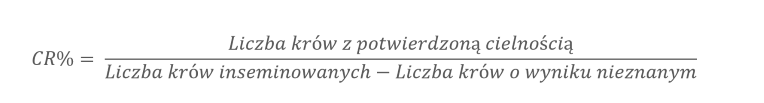 Dla wybranego zakresu dat DelPro FarmManager weźmie pod uwagę liczbę hodowanych zwierząt (kolumna Total Count z tabeli), liczbę zwierząt z potwierdzoną ciążą (Pregnant Count), liczbę krów do inseminacji (Open Count) oraz liczbę inseminacji których wyniku nie znamy (Other Count) do obliczenia wskaźnika CR%. Wzór CR% obejmuje liczbę uzyskanych zacieleń podzielonych przez całkowitą liczbę inseminacji zgłoszonych w tym okresie, minus liczba krów o nieznanym wyniku inseminacji. Ponadto istnieje kolumna pokazująca liczbę krów z potwierdzoną cielnością w każdym rzędzie, które później poroniły (Abort Count).