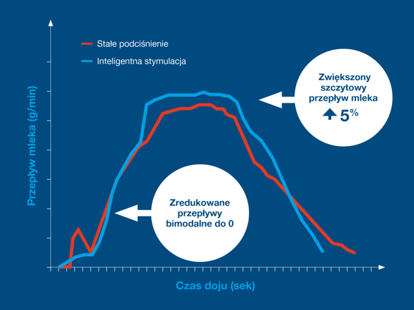 System DeLaval Flow-Responsive™ Milking wykorzystuje rzeczywisty przepływ mleka w celu dostosowania parametrów doju, takich jak podciśnienie i pulsacja, w celu stworzenia bardziej wydajnego profilu przepływu mleka.