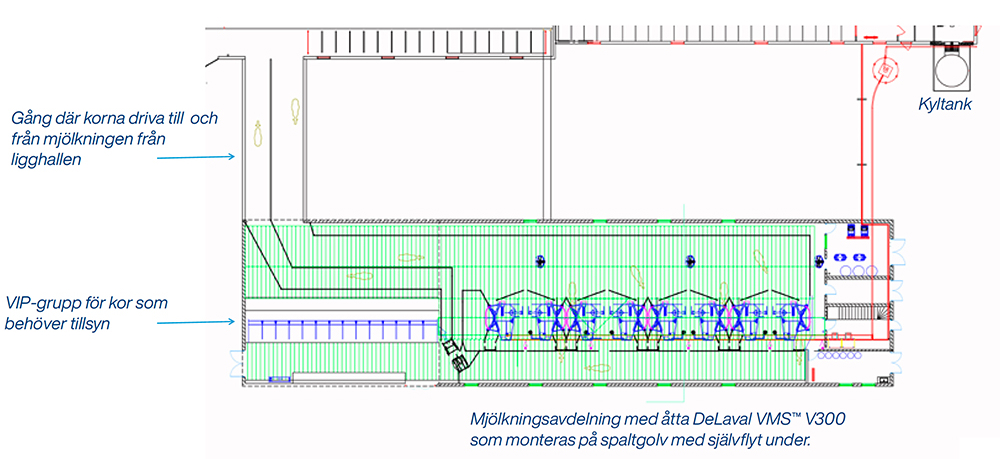 byggnaden har byggts ihop med det gamla stallet via en 15 meter lång drivgång som har både tak och väggar och genom vilken korna leds till och från mjölkningen. Robotarna står på spaltgolv med självflyt under.