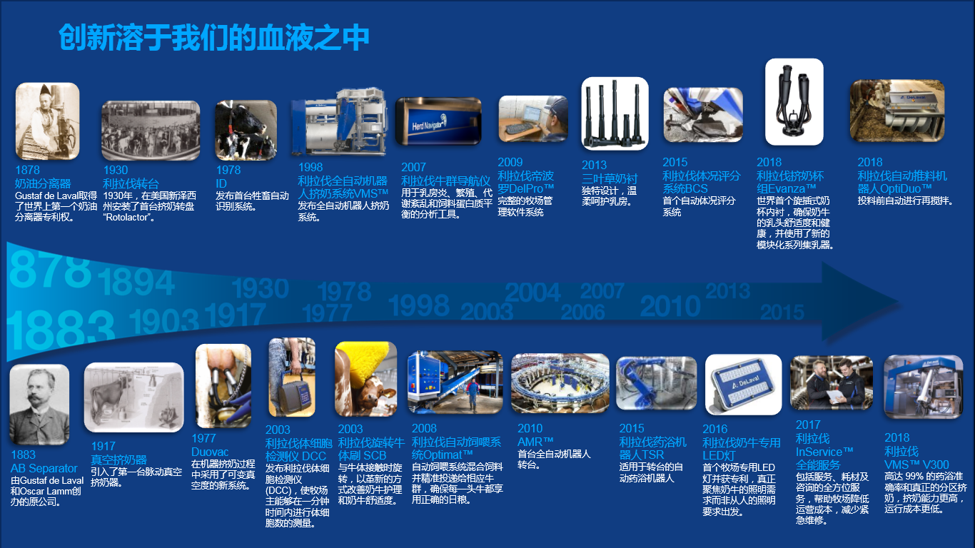 在这样一位极具创新精神的创始人的引导下,一百余年的时间里,利拉伐一直专注牧场,不断创新。时至今日,我们在全球拥有7个研发中心,掌握着1500余项发明专利。“创新溶于我们的血液之中”,对于利拉伐来说,绝不仅仅是一句口号,而是我们一直在实践的准则。